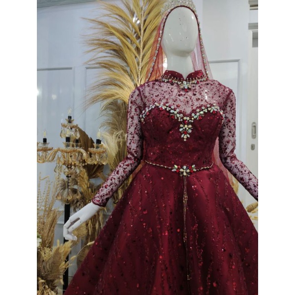 Beli gown pengantin warna merah maroon/merah hati terbaru di shopee.